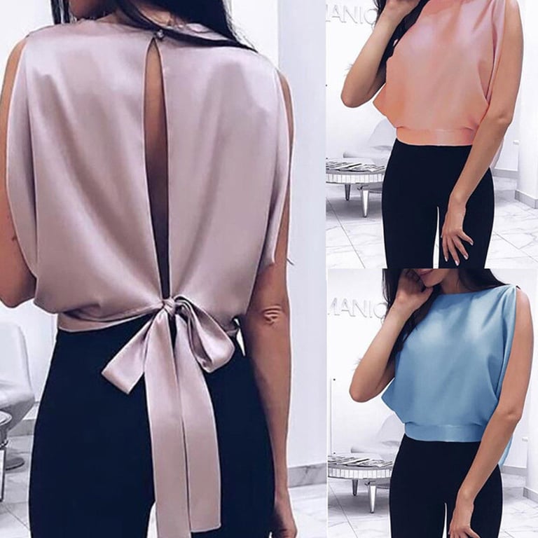 Women's satin crop top without sleeves. The top features a back neckline with a bow tie. Smooth shiny material. Available in several colour options.
