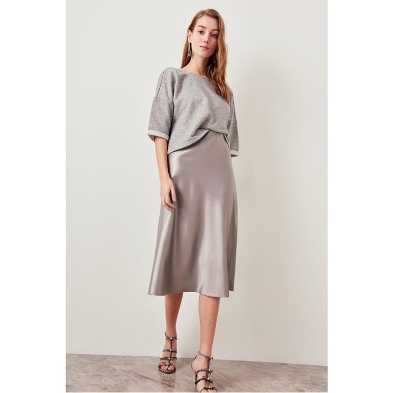 Women's midi skirt to the knee. Flowing loose fit. Satin look. Available in multiple colour options.