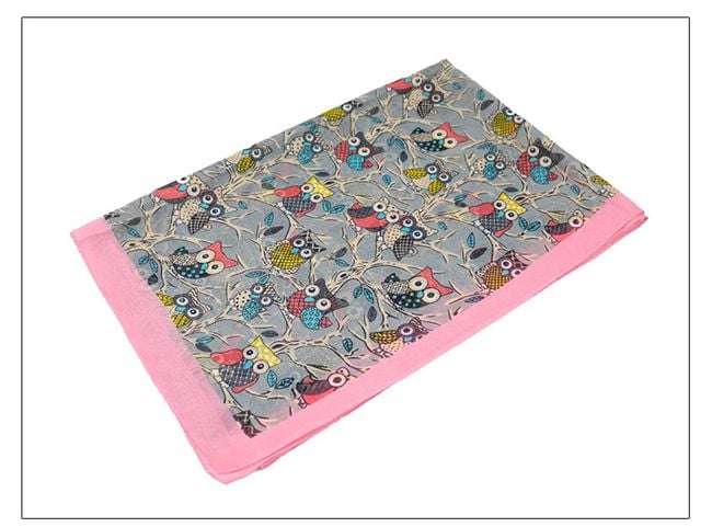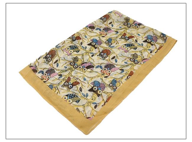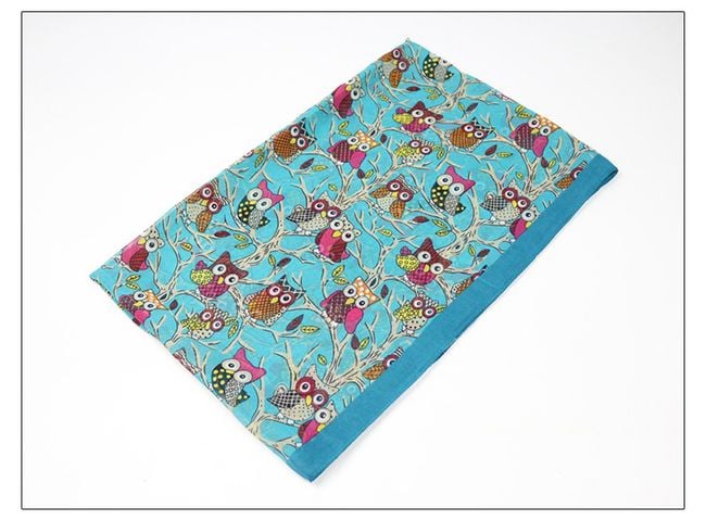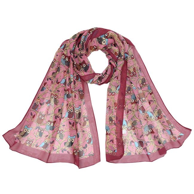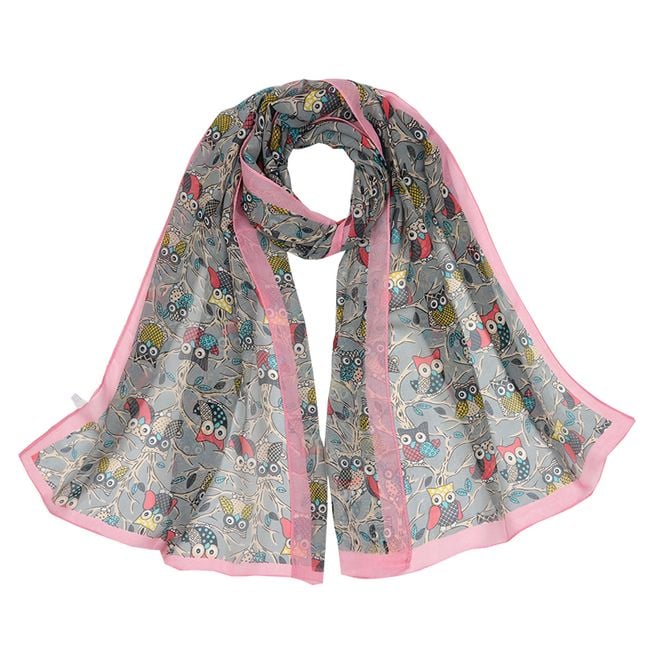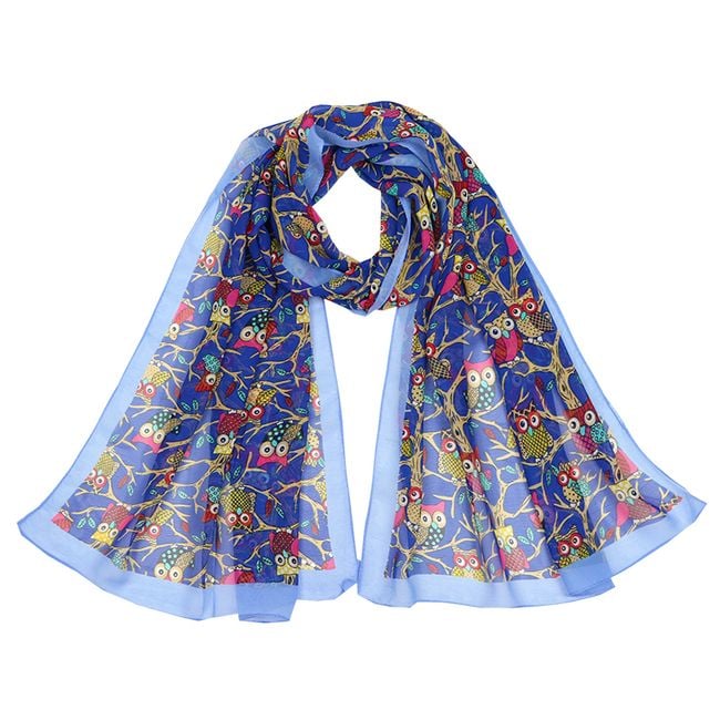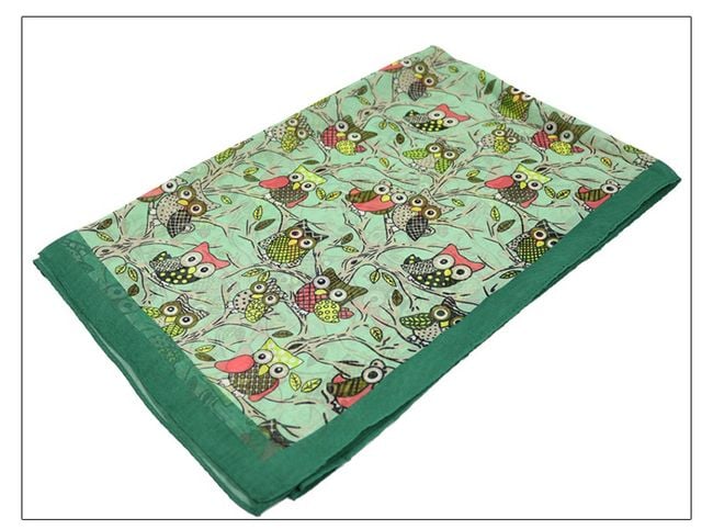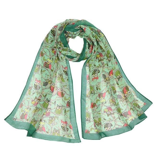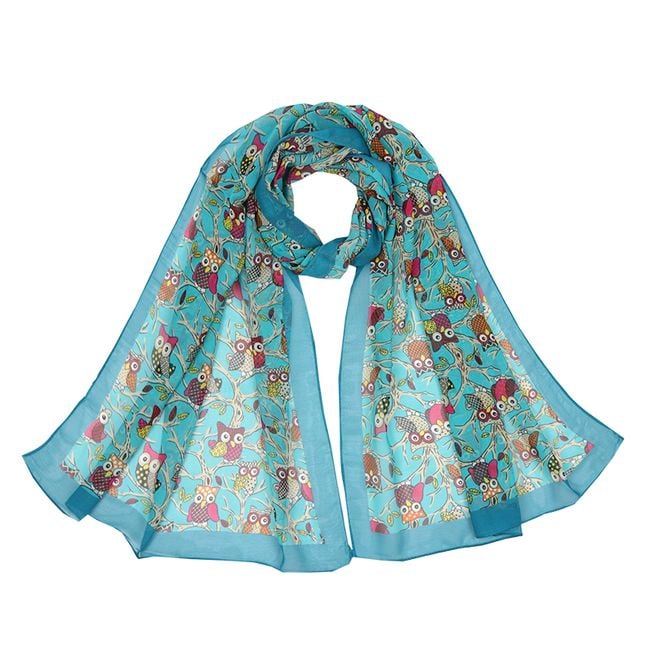 The ladies' scarf adorned with owls serves as an interesting accessory.