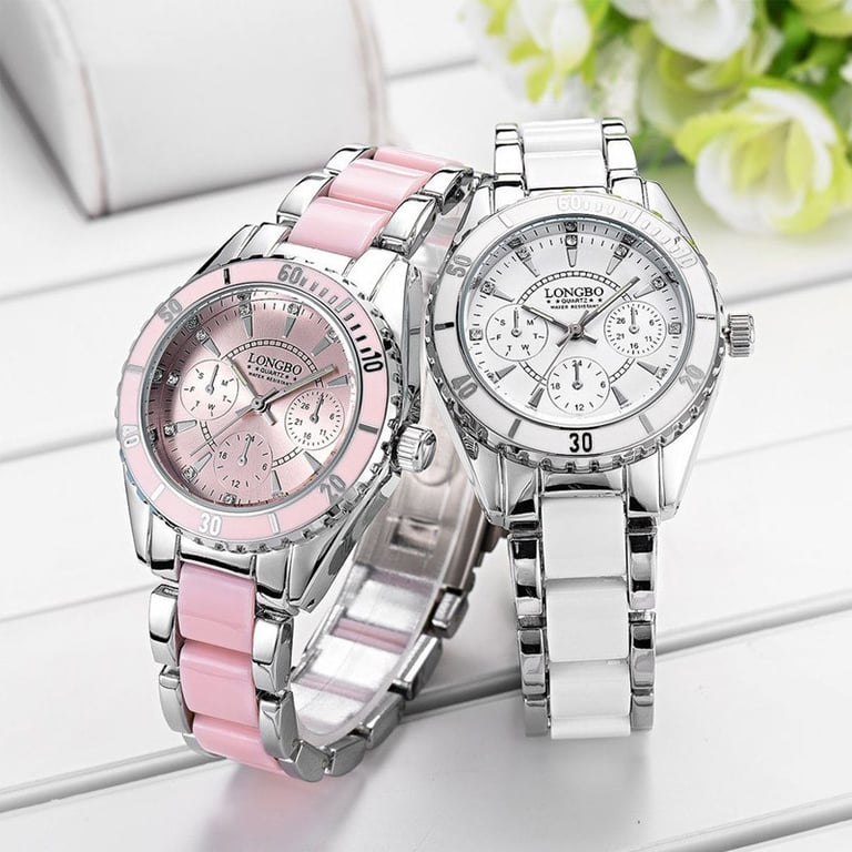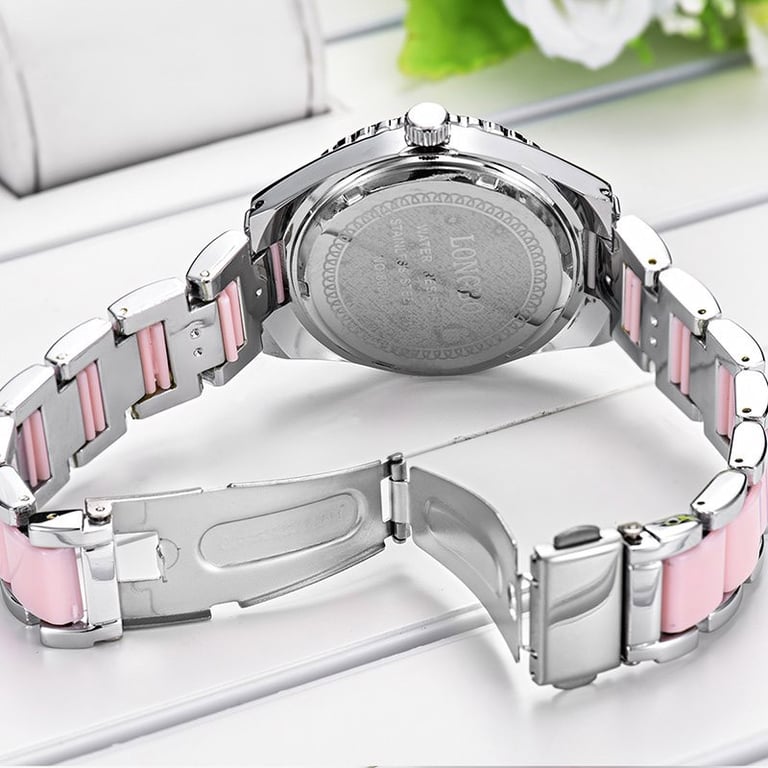 Luxury women's watch in a modern design. Ceramic strap, mineral glass. The dial is adorned with white stones. Available in two variants.