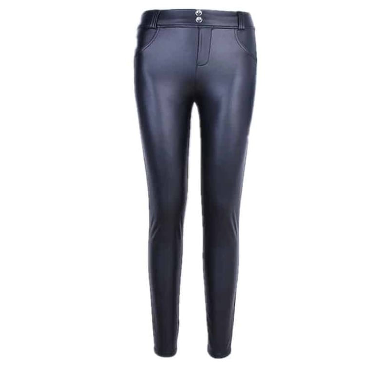 Modern women's leggings with a push-up effect made from faux leather. The trousers look great on every woman.