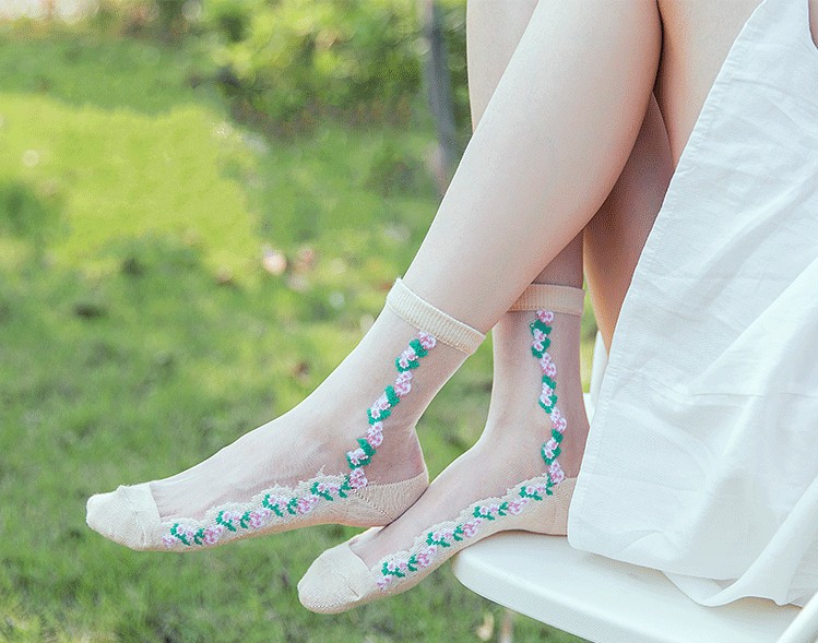 These sheer socks are adorned with delicate flowers.