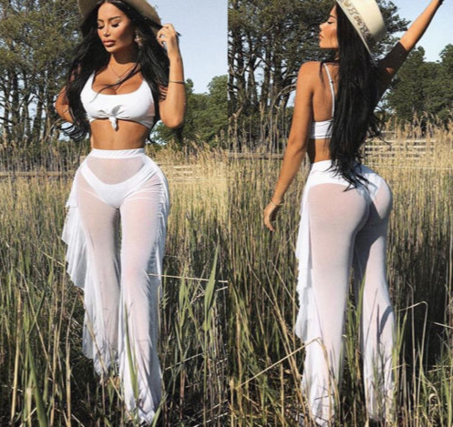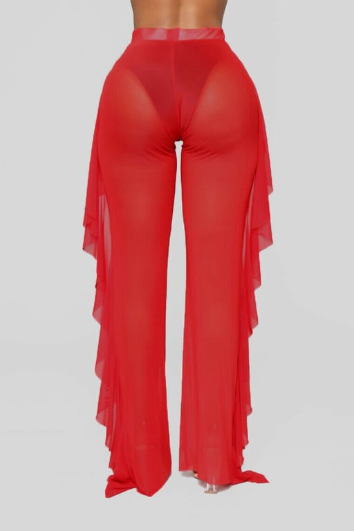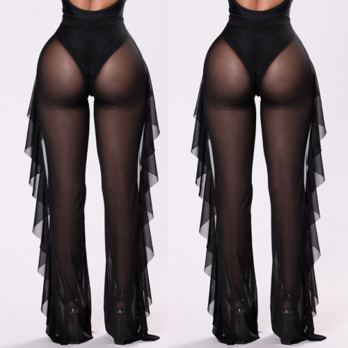 • Tags: Women's trousers, beach trousers, high waist, sheer, transparent, for swimwear, with ruffles, long trousers, wide, narrow