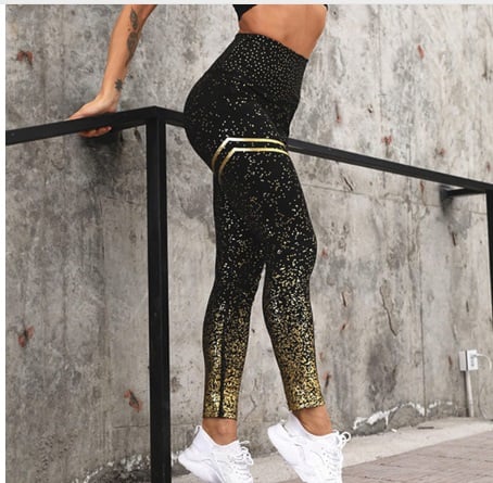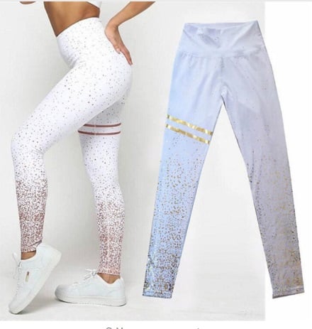 Stylish leggings with a print reminiscent of sparkling glitter. There are two stripes on the thigh that match the colour of the print on the calves and ankles. The leggings are available in several colour variations.