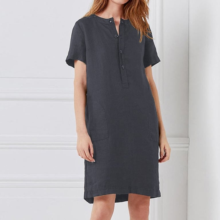 Women's casual shirt dress. The dress features short sleeves and a V-neck with button fastening. Loose, comfortable fit. Lightweight material. Plus size available. Available in several colours.
