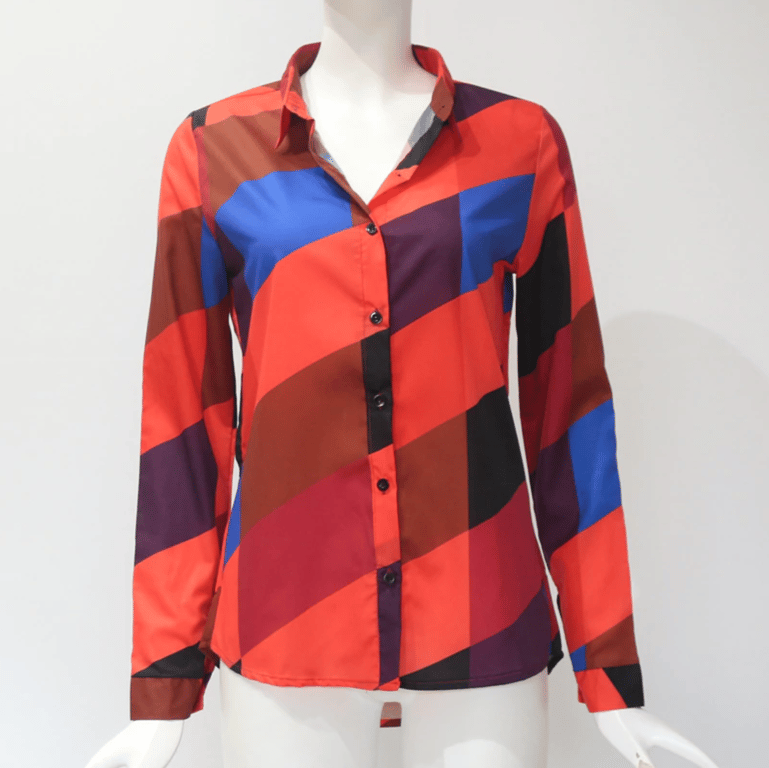 A women's shirt with a pattern. Thanks to its cheerful colours, it is an ideal choice for the beach or by the water.