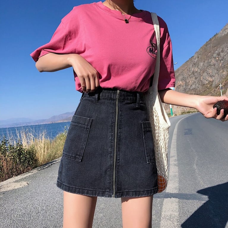 Women's denim skirt with a high waist and a zip fastening at the front. Available in two colour variants.