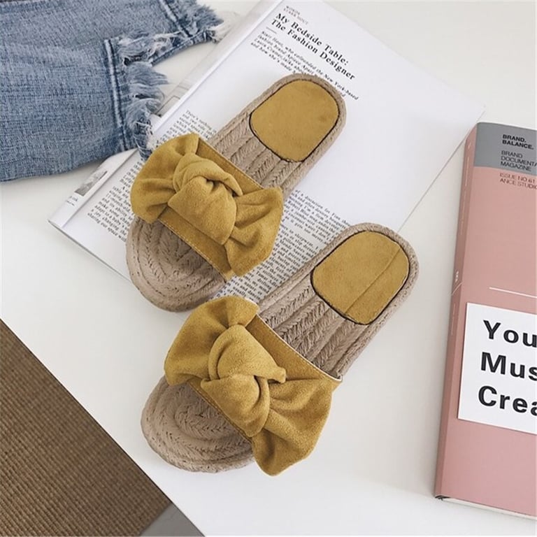 Women's slippers with a decorative bow. Wide strap and open toe and heel. Flat sole. Available in multiple colour options.