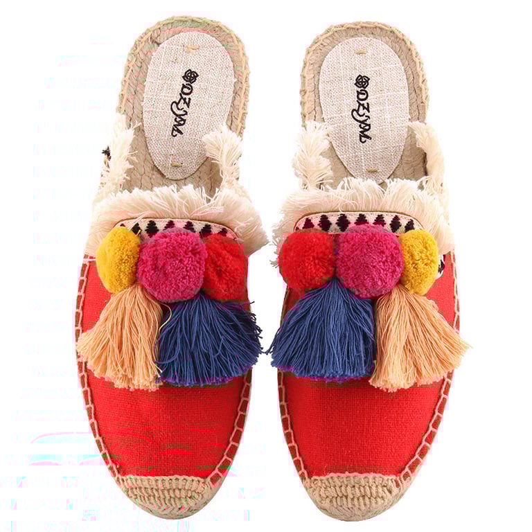 The slippers are adorned with pom-poms and fringes.