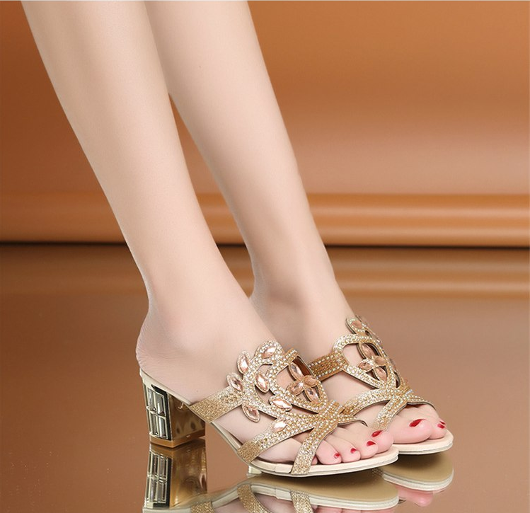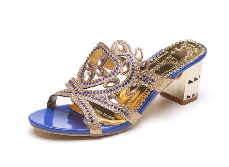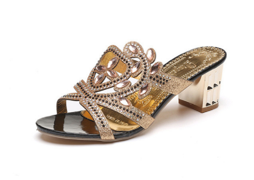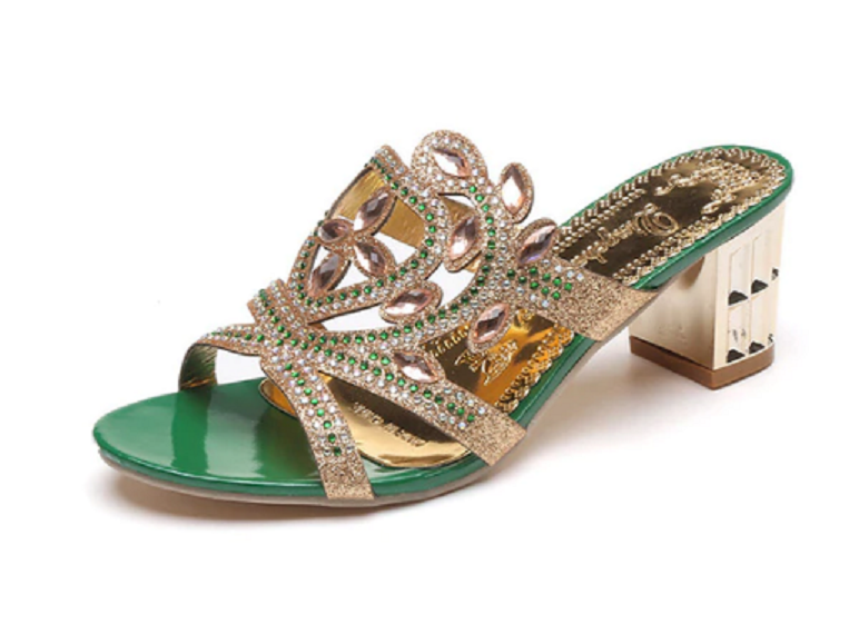 You will definitely love these beautiful heeled slippers adorned with rhinestones.