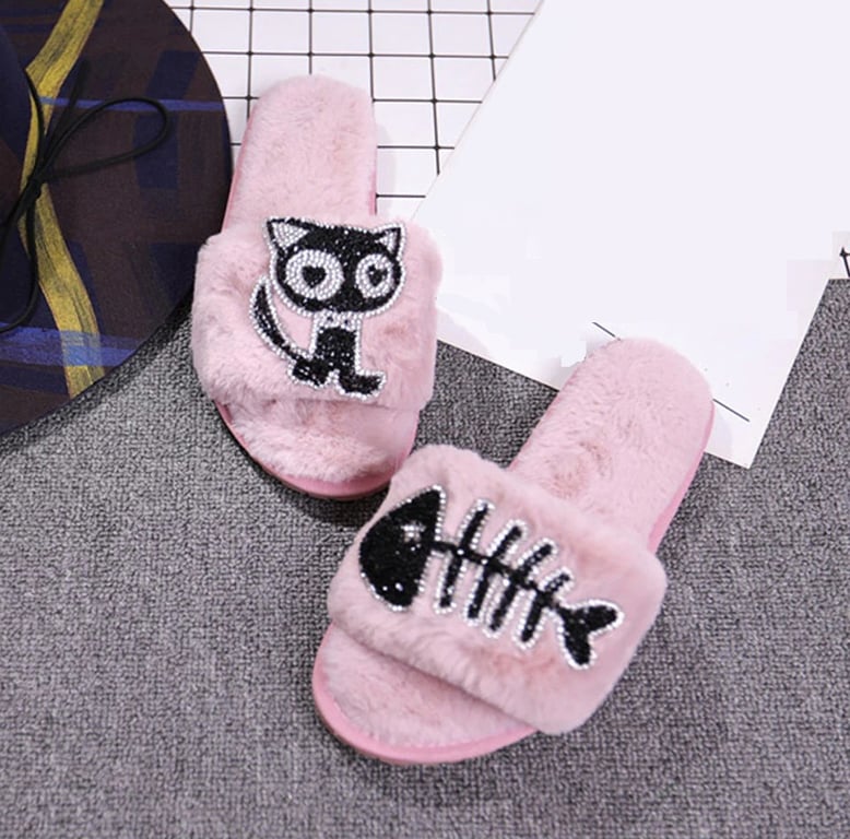 These beautiful slippers are adorned with rhinestones in the shape of a cat and a fishbone.
