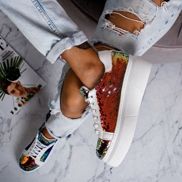 Women's trainers with colourful sequins. Lace-up. Round sturdy toe. High platform sole. Available in two variants.