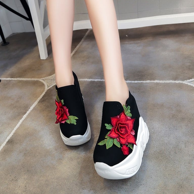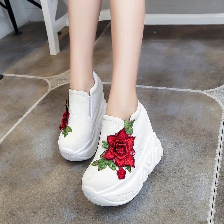 You will fall in love with these high-soled sneakers featuring a floral print.