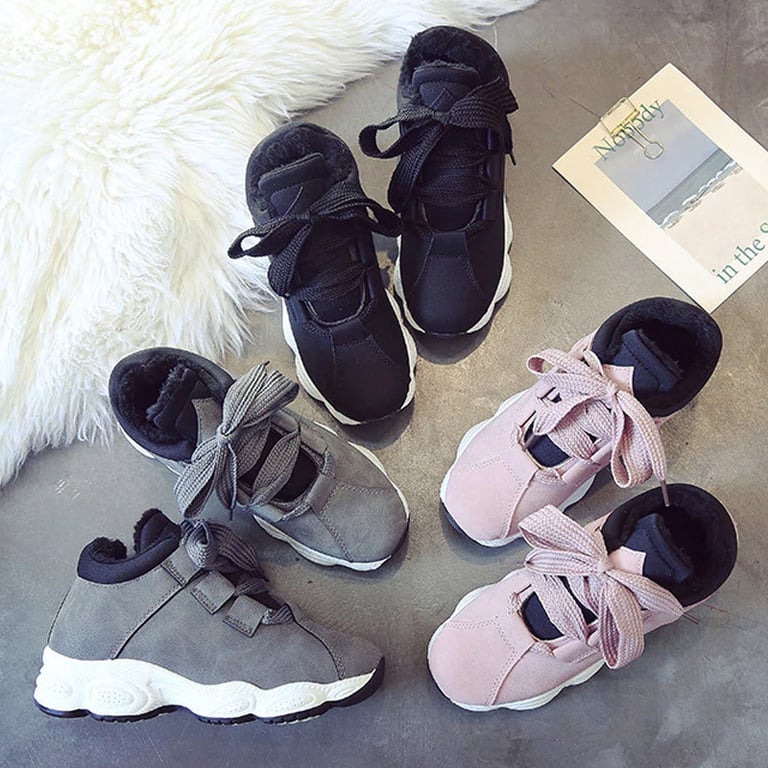 Women's low-top trainers with lacing on a high platform. The shoes are lined with fur on the inside. Available in four colour options – black, white, pink, grey.