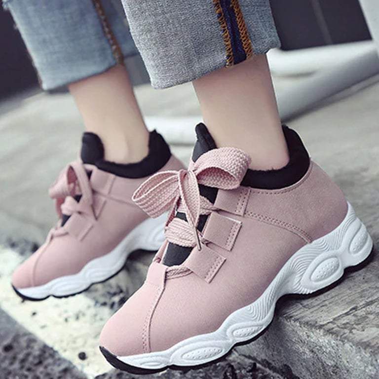 Women's low-top trainers with lacing on a high platform. The shoes are lined with fur on the inside. Available in four colour options – black, white, pink, grey.