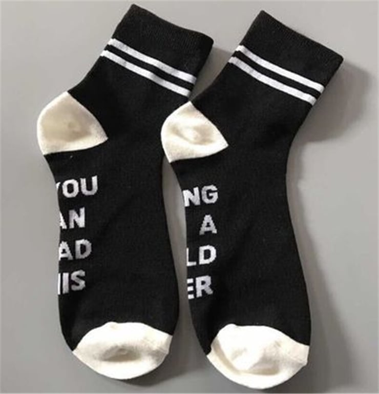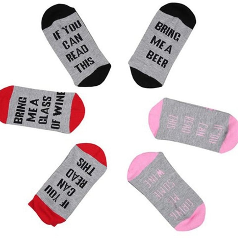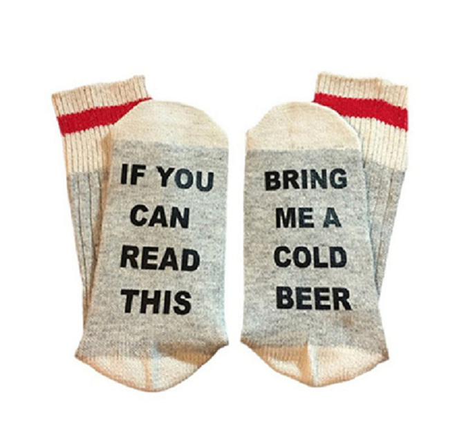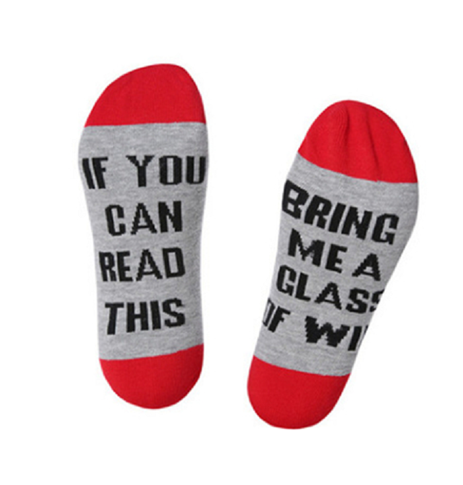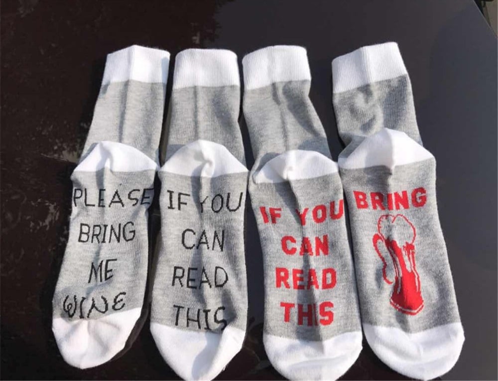 The socks come in various options with the inscription "If You Can Read This, Bring Me a Cup of Wine, Coffee or Beer."