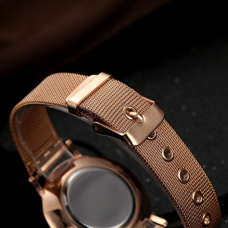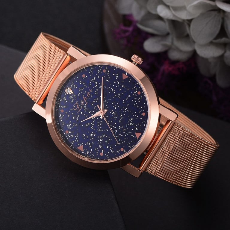 Women's stylish watch in rose gold. The dial is unnumbered and decorated with small glitter and gemstones. Adjustable strap.