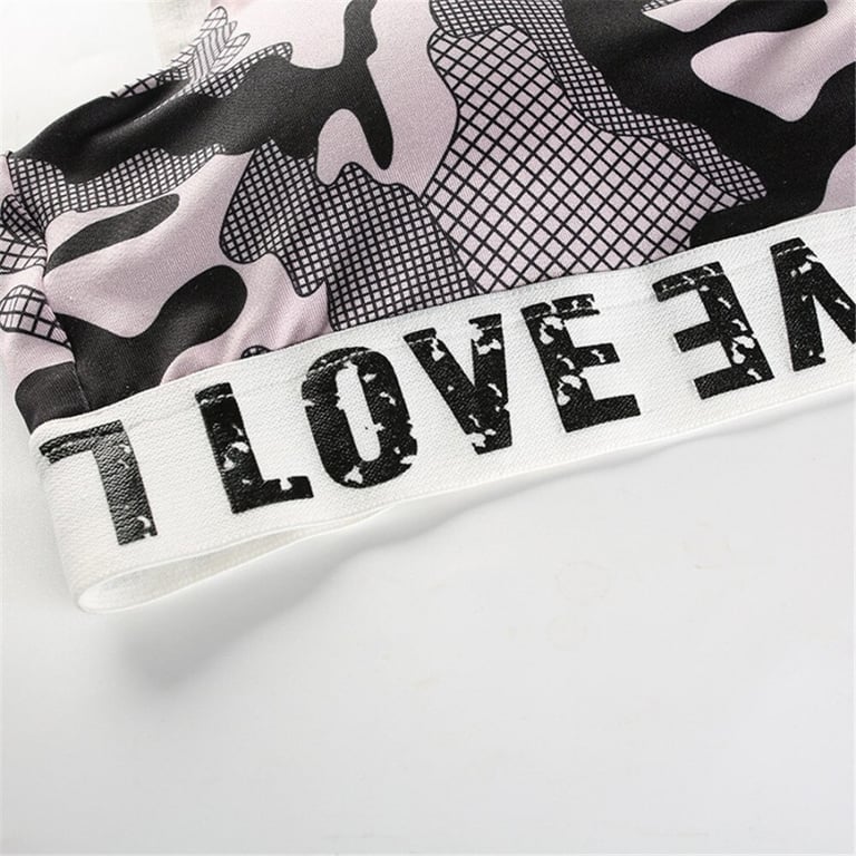 Women's sports set of leggings with an elastic waistband and a fitted crop top. Printed with an army pattern. Deep round neckline.