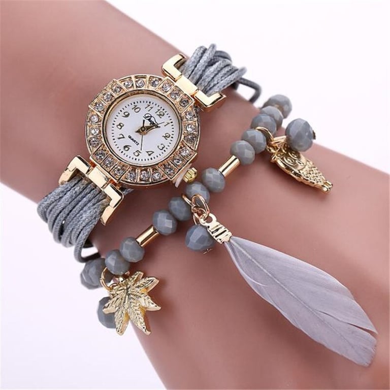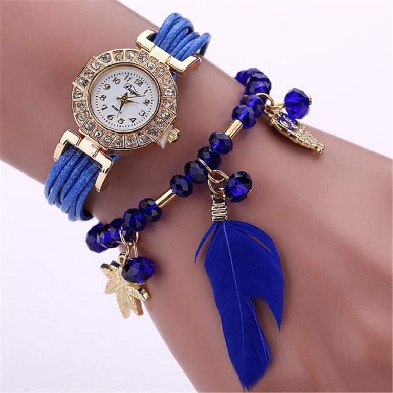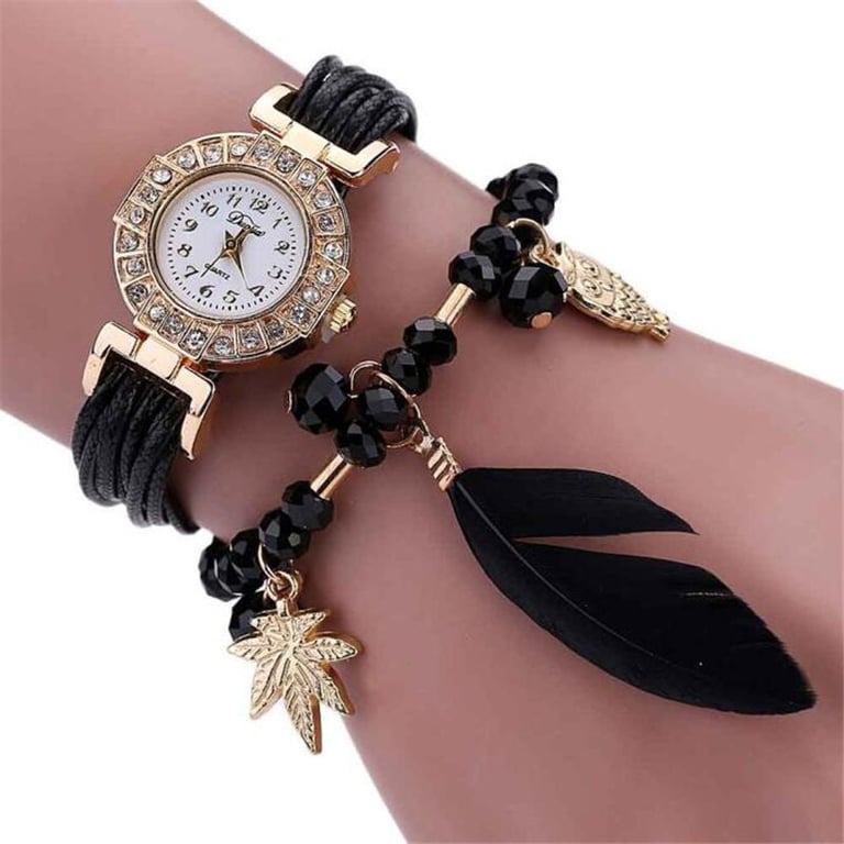 Stylish watch with costume jewellery elements and an elegant feather. The dial is adorned with decorative stones.
