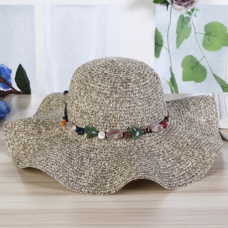 • Beautiful women's summer straw hat adorned around the edge with decorative stones and beads.