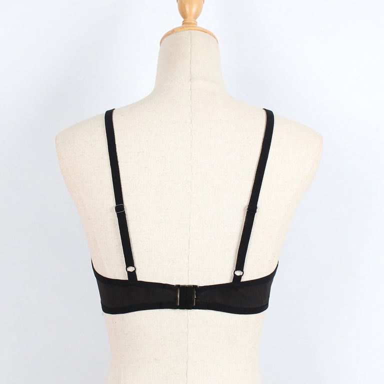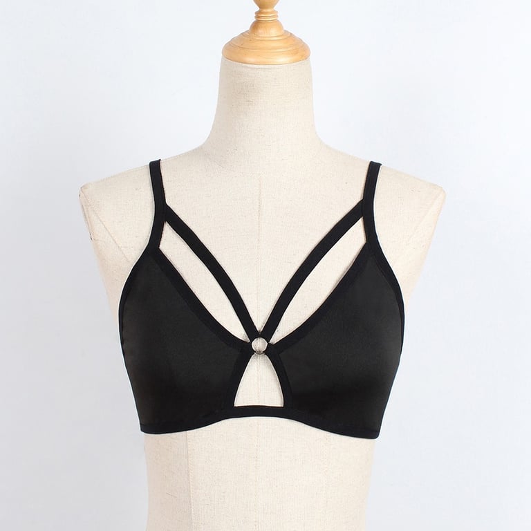 The bra features an unconventional cut. The neckline is adorned with straps that converge at the bridge.