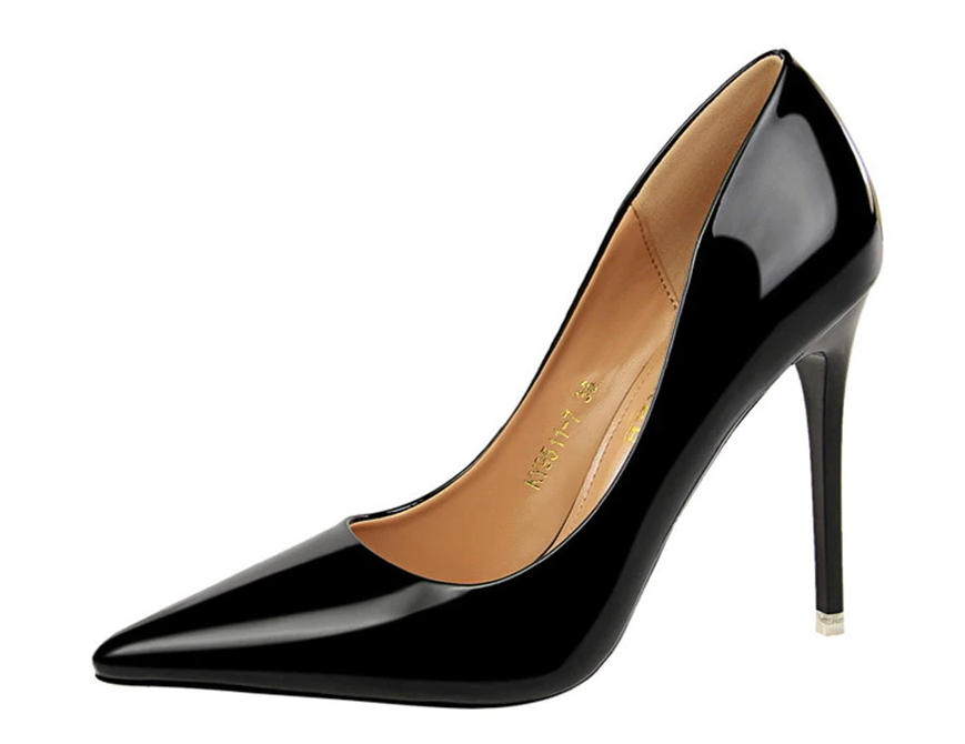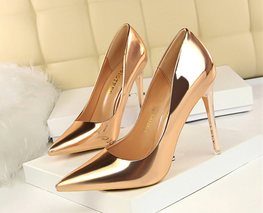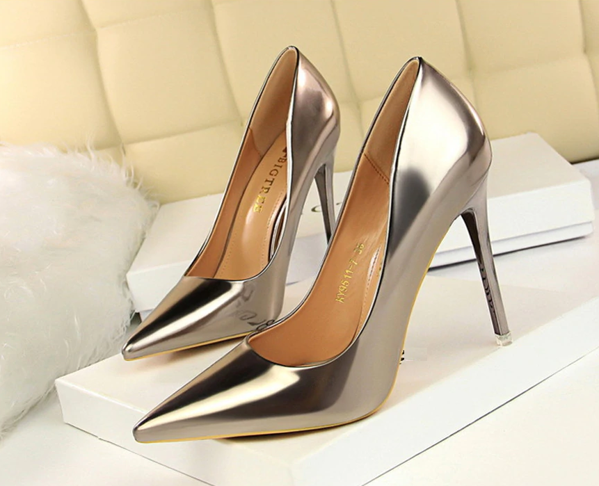 You will absolutely fall in love with the elegance of these shiny high-heeled shoes.