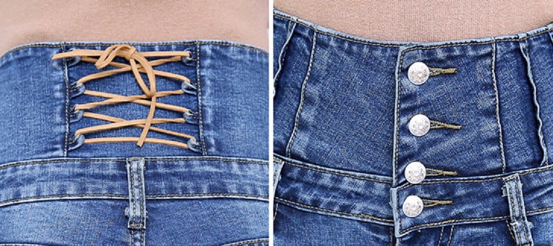 The jeans feature three buttons at the front and lacing at the back.