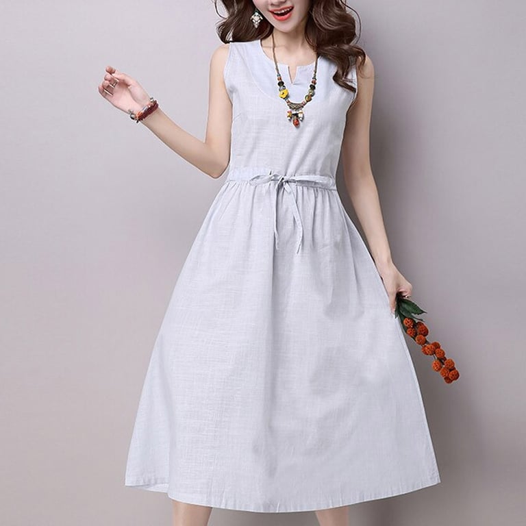Women's sleeveless summer dress. Loose fit with an elastic drawstring at the waist. Long wide skirt. Round neckline. Available in multiple colour options.