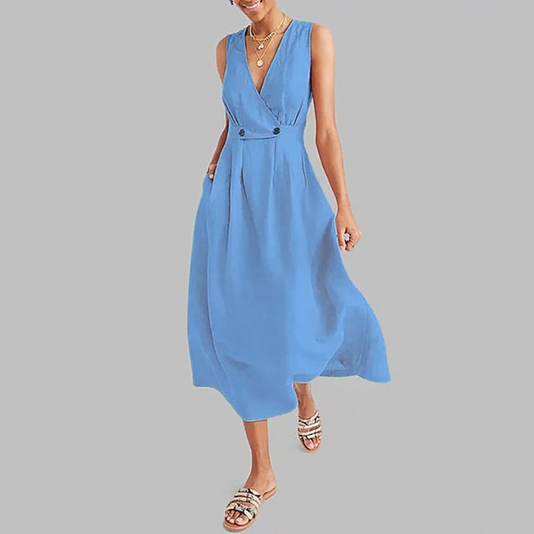 Women's dress with wide straps and a V-neck wrap neckline. Long flowing skirt. Loose fit, ideal for summer days. Available in multiple colour options.