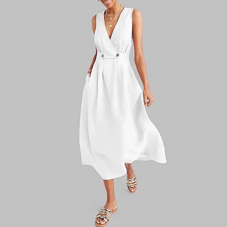 Women's dress with wide straps and a V-neck wrap neckline. Long flowing skirt. Loose fit, perfect for summer days. Available in multiple colour options.