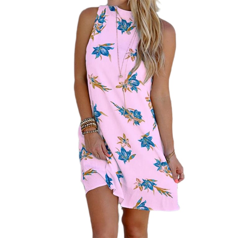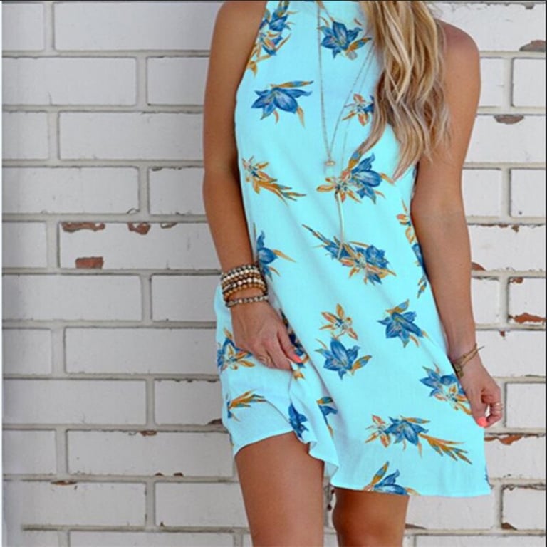 Women's sleeveless summer dress. Loose short cut with a back neckline. Colourful floral print. Available in multiple variants.