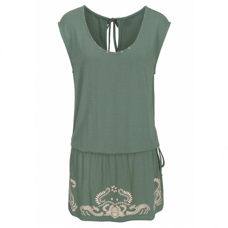 Women's summer dress with short sleeves and a round neckline. Loose fit with an elastic waistband. Available in two colour options.
