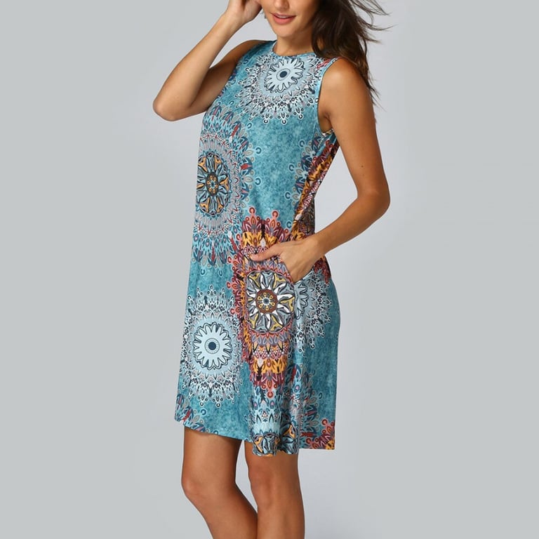 Women's sleeveless summer dress. Short loose fit with an A-line skirt and side pockets. Printed with a colourful pattern.