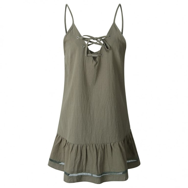 Women's short dress with narrow straps. The dress features a V-neckline with lacing and a skirt adorned with a ruffle. Made from a lightweight, airy material. Available in two variants.