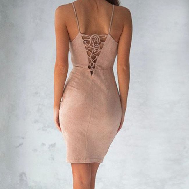 Women's fitted mini dress is sleeveless and features spaghetti straps. Available in 4 colours.