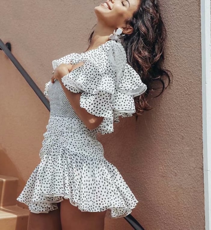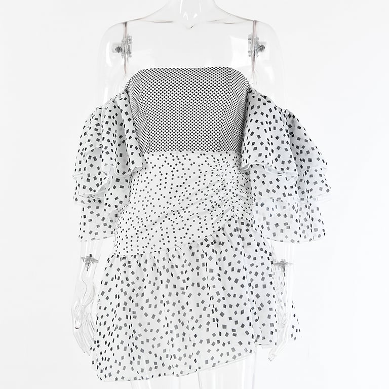 Women's summer dress with ruffled sleeves and exposed shoulders.