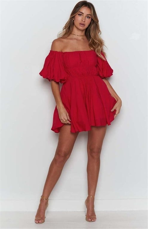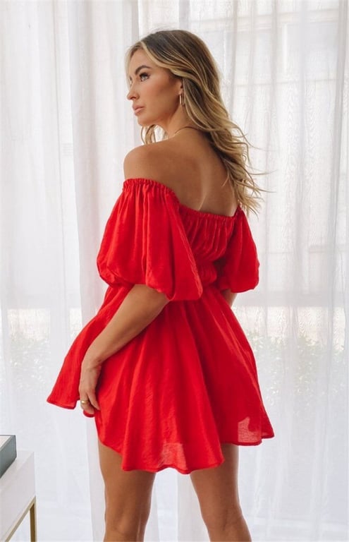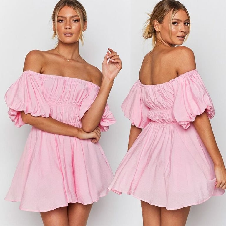 Ladies' summer elegant dress with off-the-shoulder sleeves.
