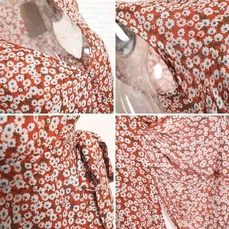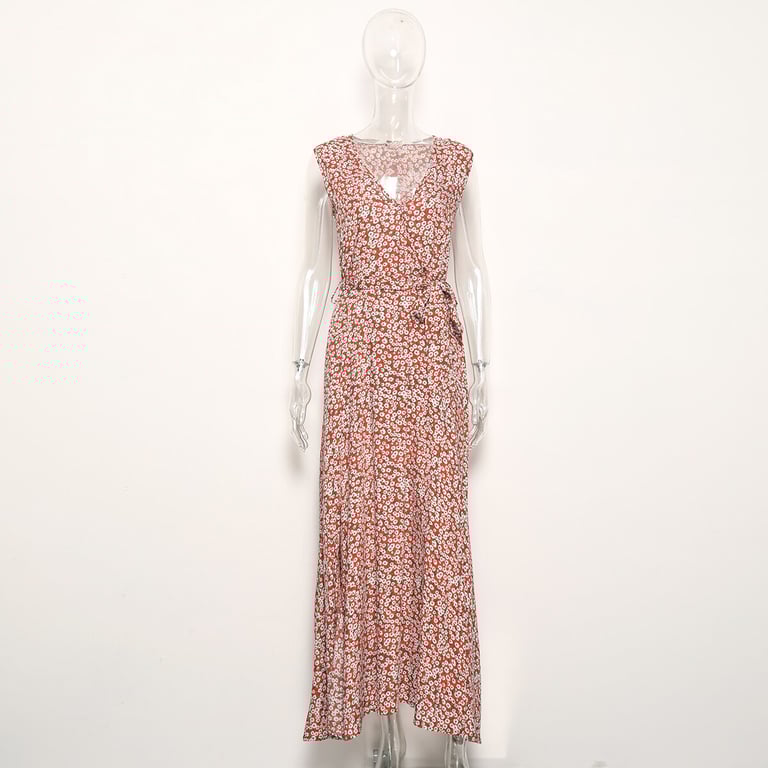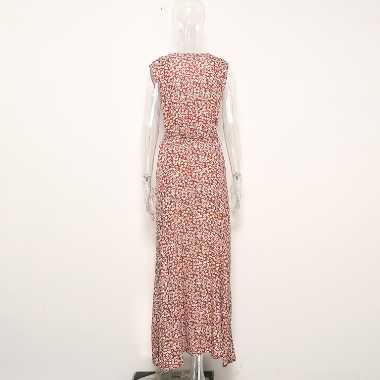 The dress has a red background and is printed with small flowers. There is a sexy slit at the bottom hem. It also features a V-neckline and is sleeveless, making it ideal for spring or summer.