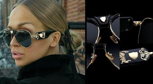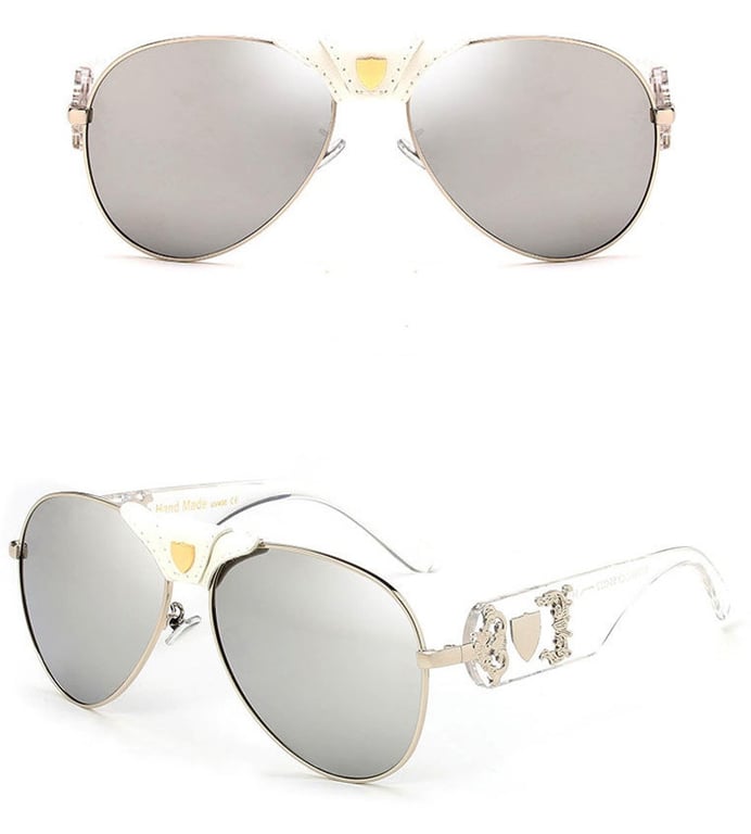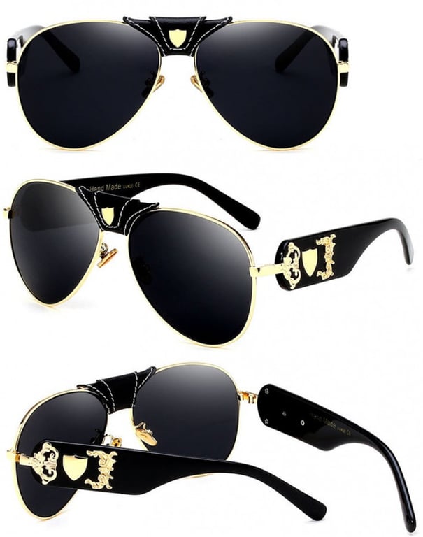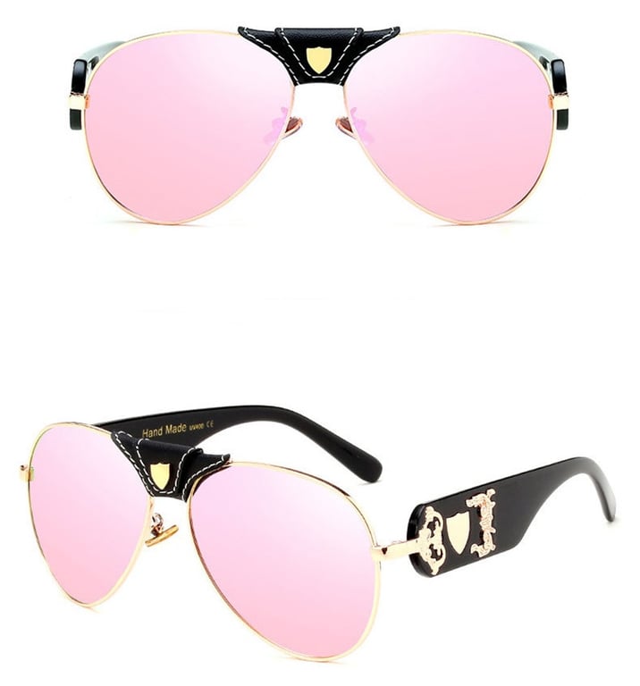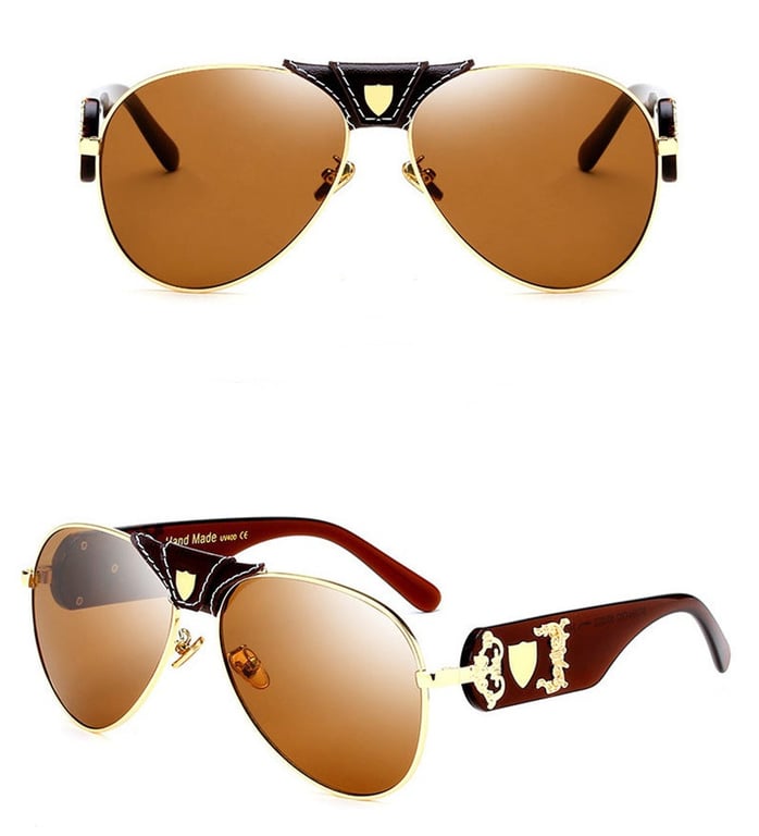 Luxury women's pilot sunglasses with an elegant leather application and vintage-style metal decor.