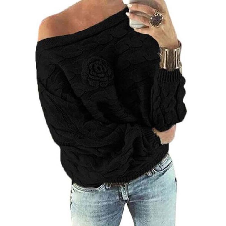 Women's knitted loose-fitting sweater with wide sleeves. The sweater features off-the-shoulder design and a knitted rose on the chest. Available in various colour options.