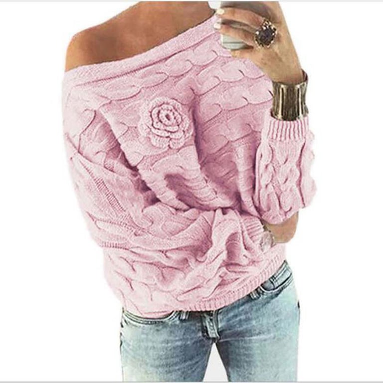 Women's knitted loose-fitting sweater with wide sleeves. The sweater features off-shoulder design and a knitted rose on the chest. Available in various colour options.