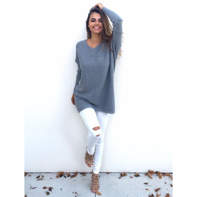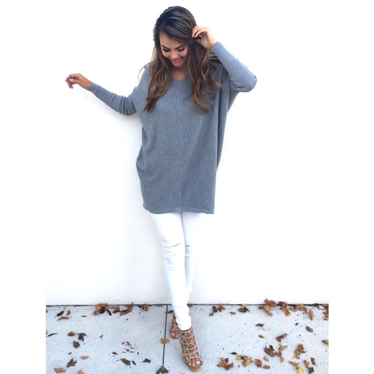 Women's comfortable long loose-fitting sweater with long sleeves and a V-neck. Available in four colour options.