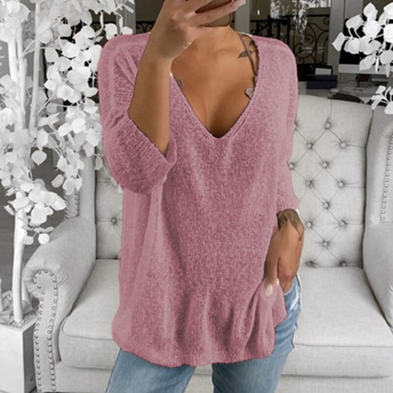 Women's sweater with a deep V-neck. The sweater has a loose, longer fit with long sleeves. Available in multiple colour options.