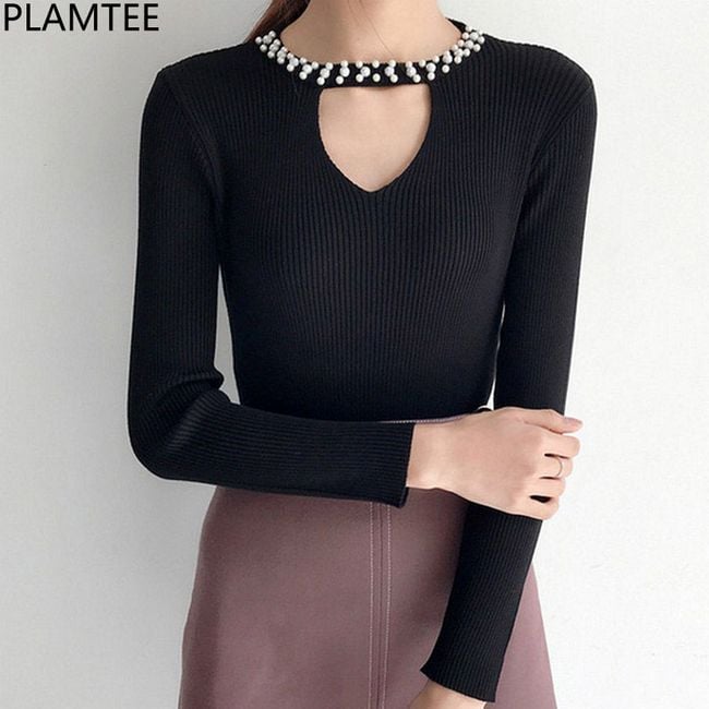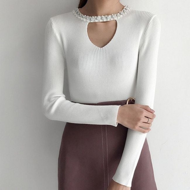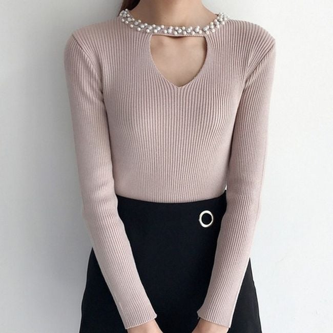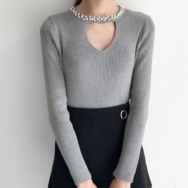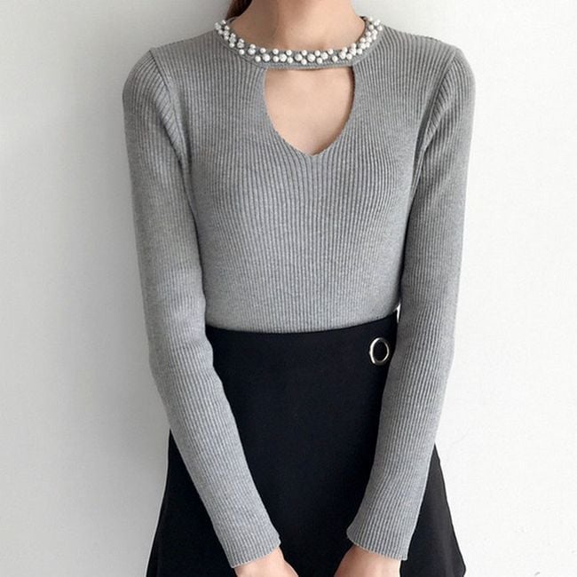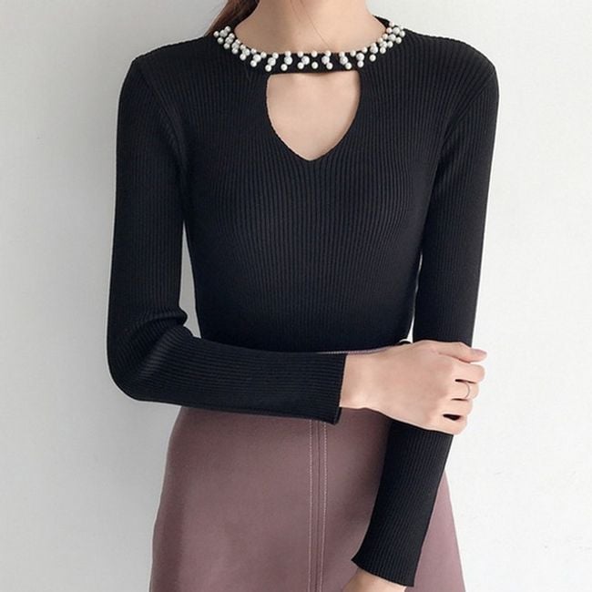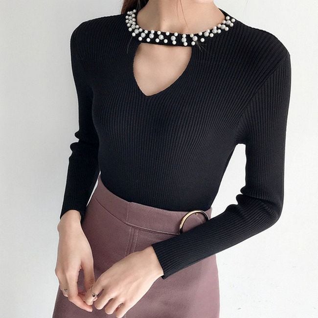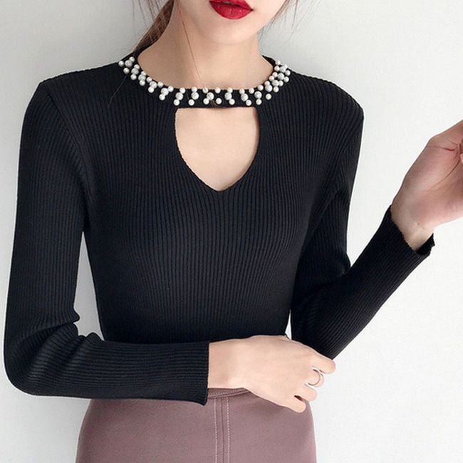 The women's sweater adorned with rhinestones around the neck serves as an interesting accessory.