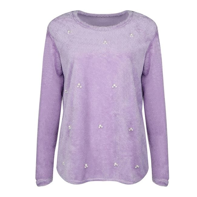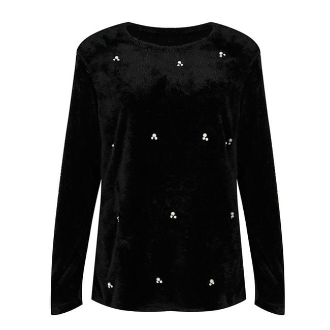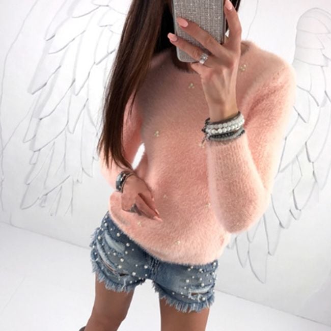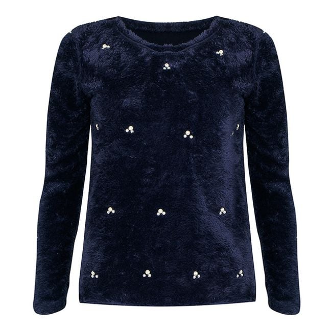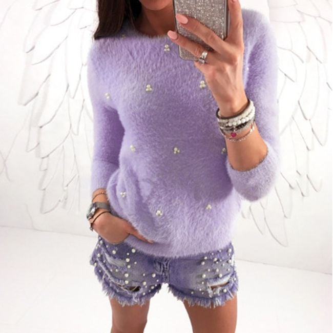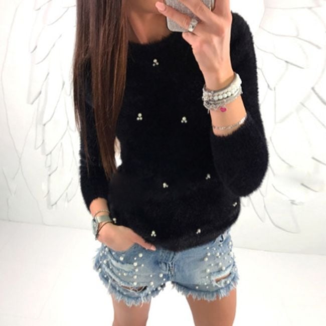 The sweater is adorned with artificial pearls and is ideal for winter.