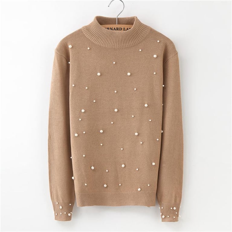 Women's sweater with a roll neck and long sleeves. One size fits all. The front of the sweater is adorned with white pearls. Available in many colour variations.