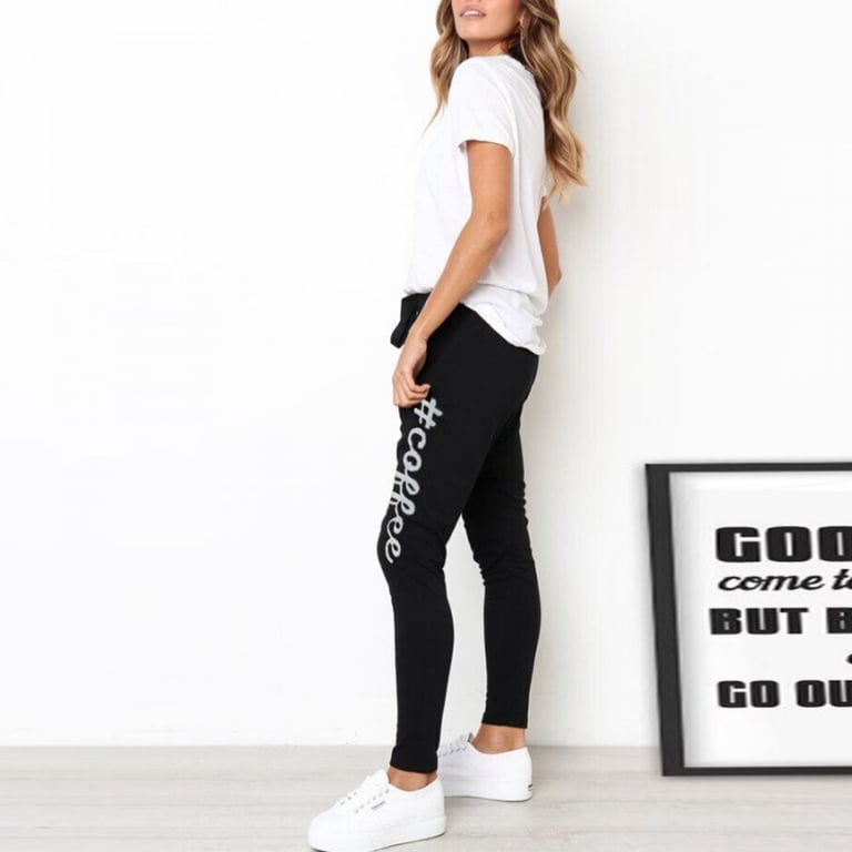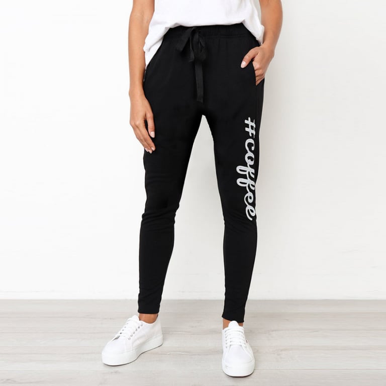 Women's sweatpants with an elastic waistband and tapered legs. Print with text on the front.