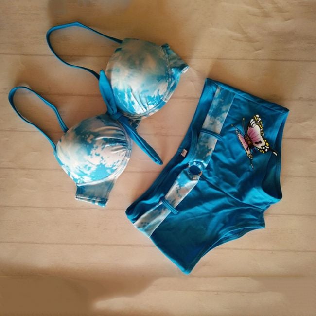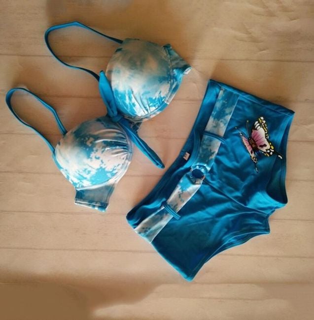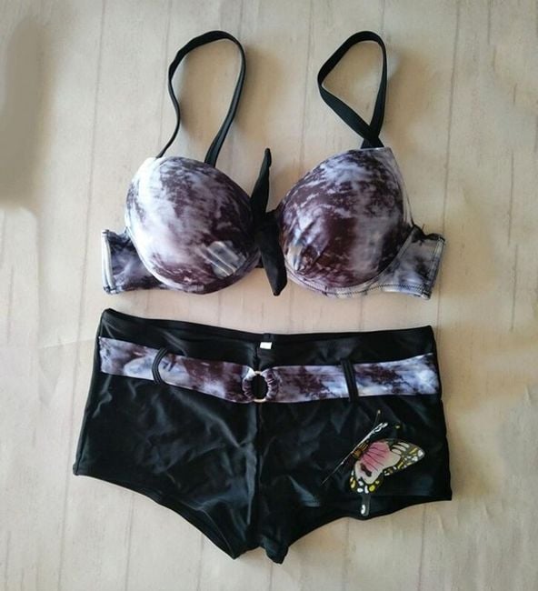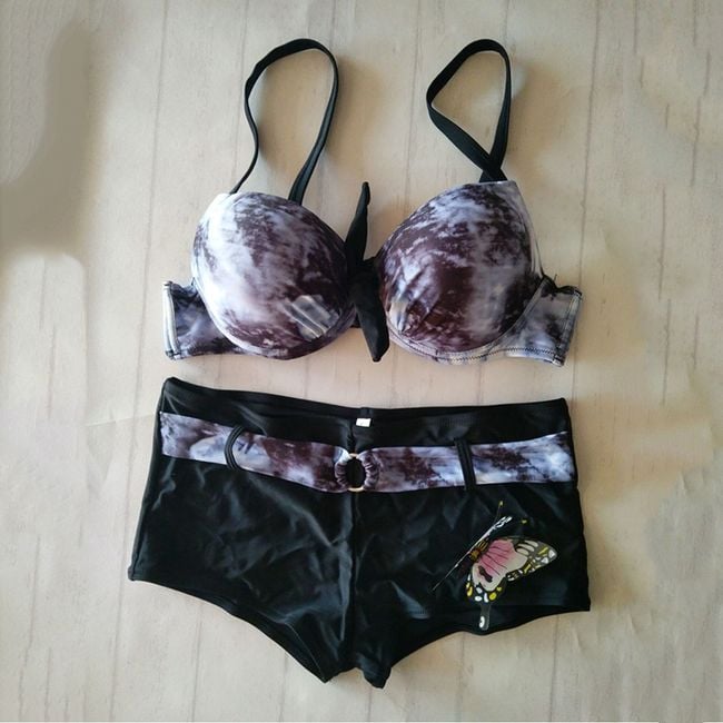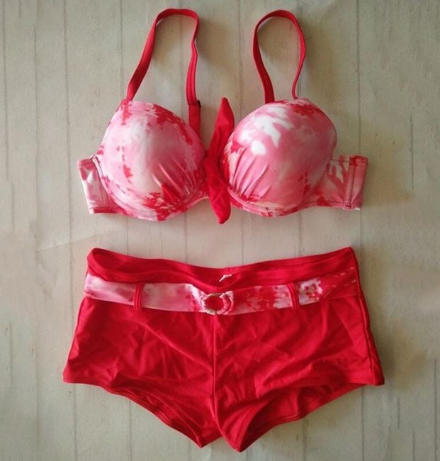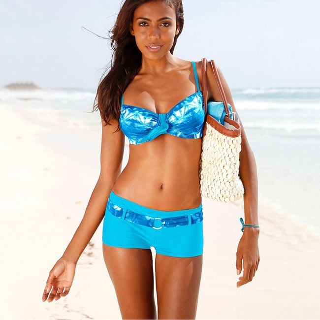 Stylish swimwear with narrow straps features a bottom part in the form of shorts. Available in 3 colour variants.