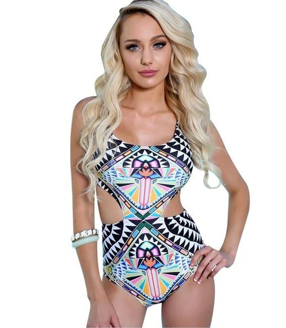 Show off your curves and tanned body in a one-piece bohemian swimsuit with an open waist and back.