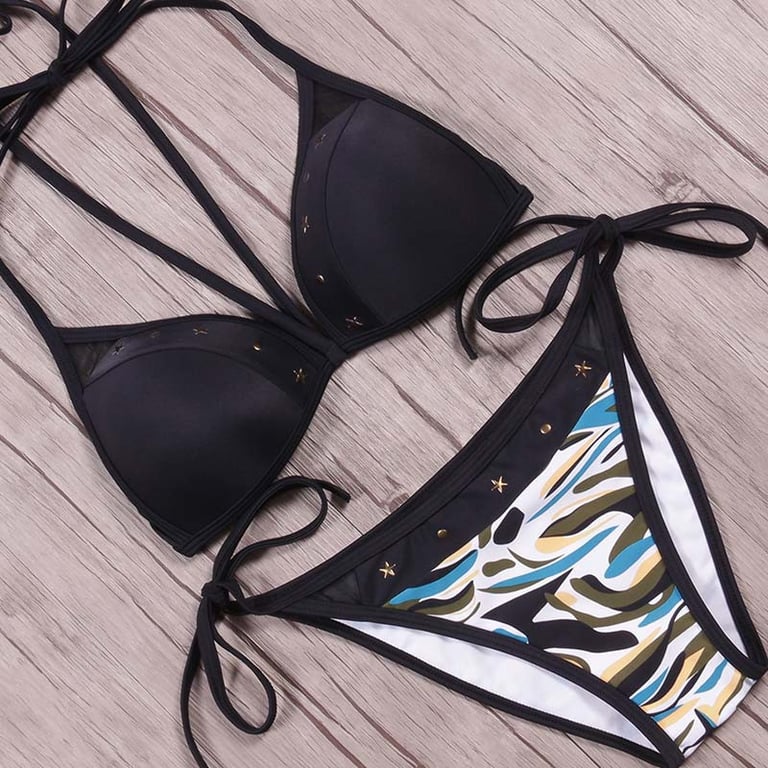 Stylish two-piece swimsuit that will make you shine anywhere. Try the modern camouflage pattern.